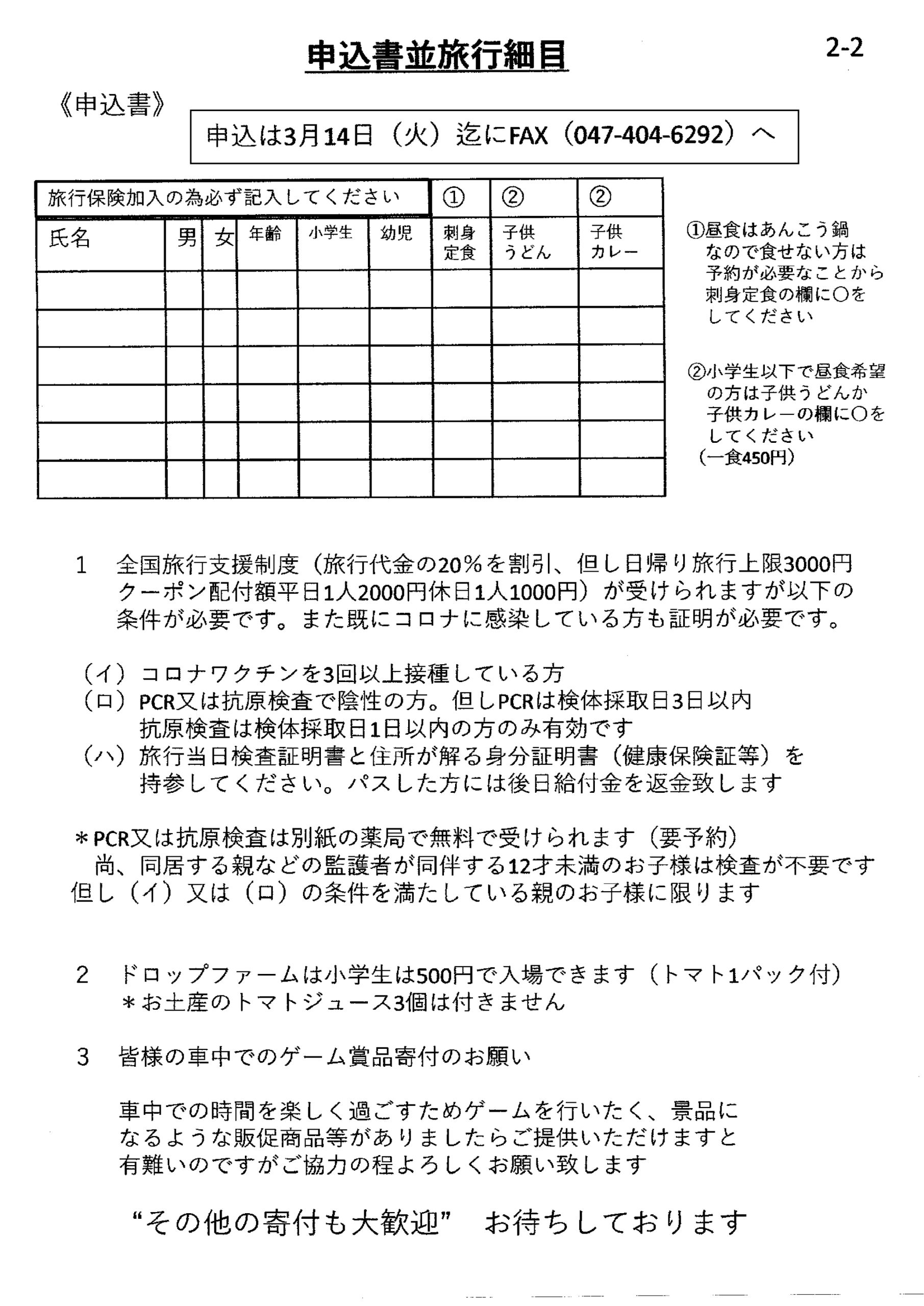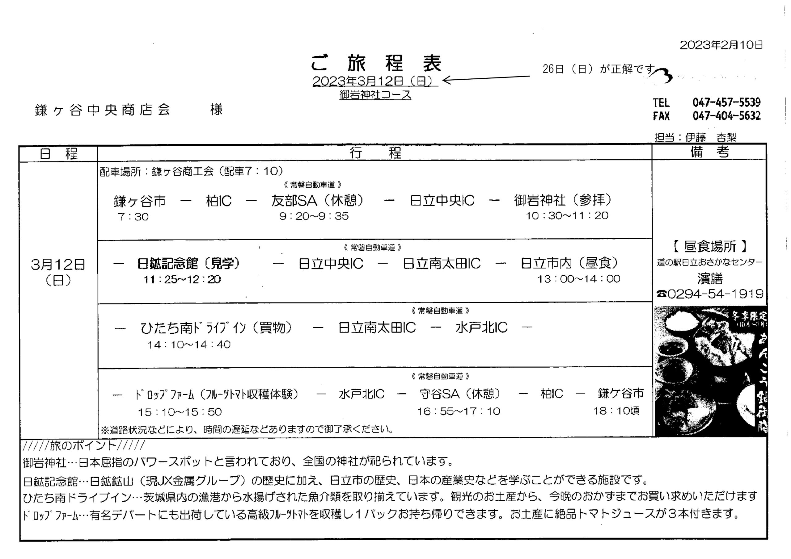 日帰りバス旅行のご案内 2023年3月12日 最終更新日時 : 2023年3月15日 kamachuo鎌ケ谷市中央商店会「グルメ(アンコウ鍋)・パワースポット(御岩神社)・ドロップファーム(トマト収穫体験)」盛り沢山ツアーのご案内 \ 最新情報をチェック /FacebookXBlueskyHatenaCopy
